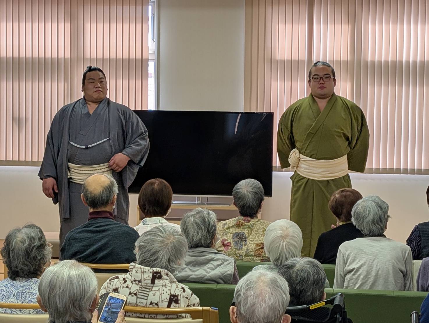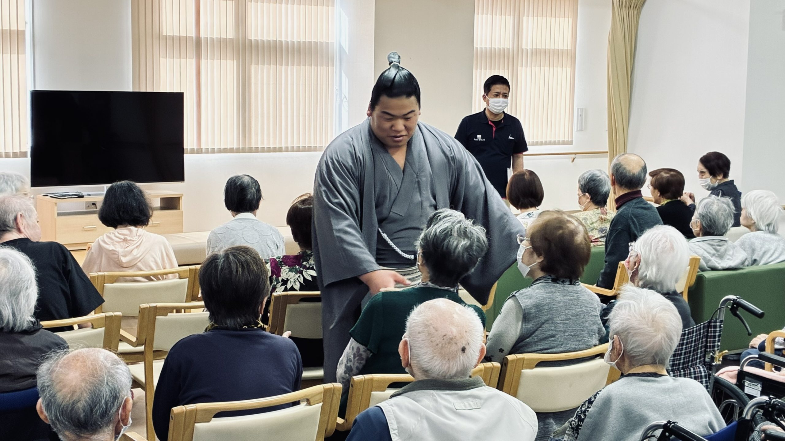 お知らせ 令和7年度 境川部屋訪問 2025年11月12日 今年度も入居者様が毎年楽しみにされています境川部屋の力士慰問があり、今回は、平戸海関と黒姫山さんに来て頂きました。テレビ長崎、テレビさせぼも撮影・取材にも来られ、大変大盛況でした😊 平戸海関には、一人ずつ入居者様とスタッフとの握手会もして頂き、皆様の素敵な思い出となりました。ありがとうございました😊 来年の訪問も心よりお待ちしております🙌 お知らせ一覧へ トピックス 令和8年 ケアインファースト栄 元旦 新春のご挨拶 令和7年度 冬のイベント アフタヌーンティーカフェ 令和7年度 境川部屋訪問 拝啓 ご長寿の皆様方へ
