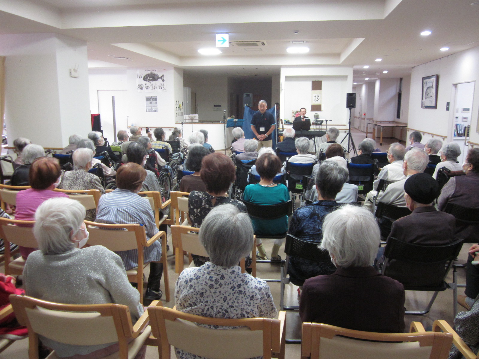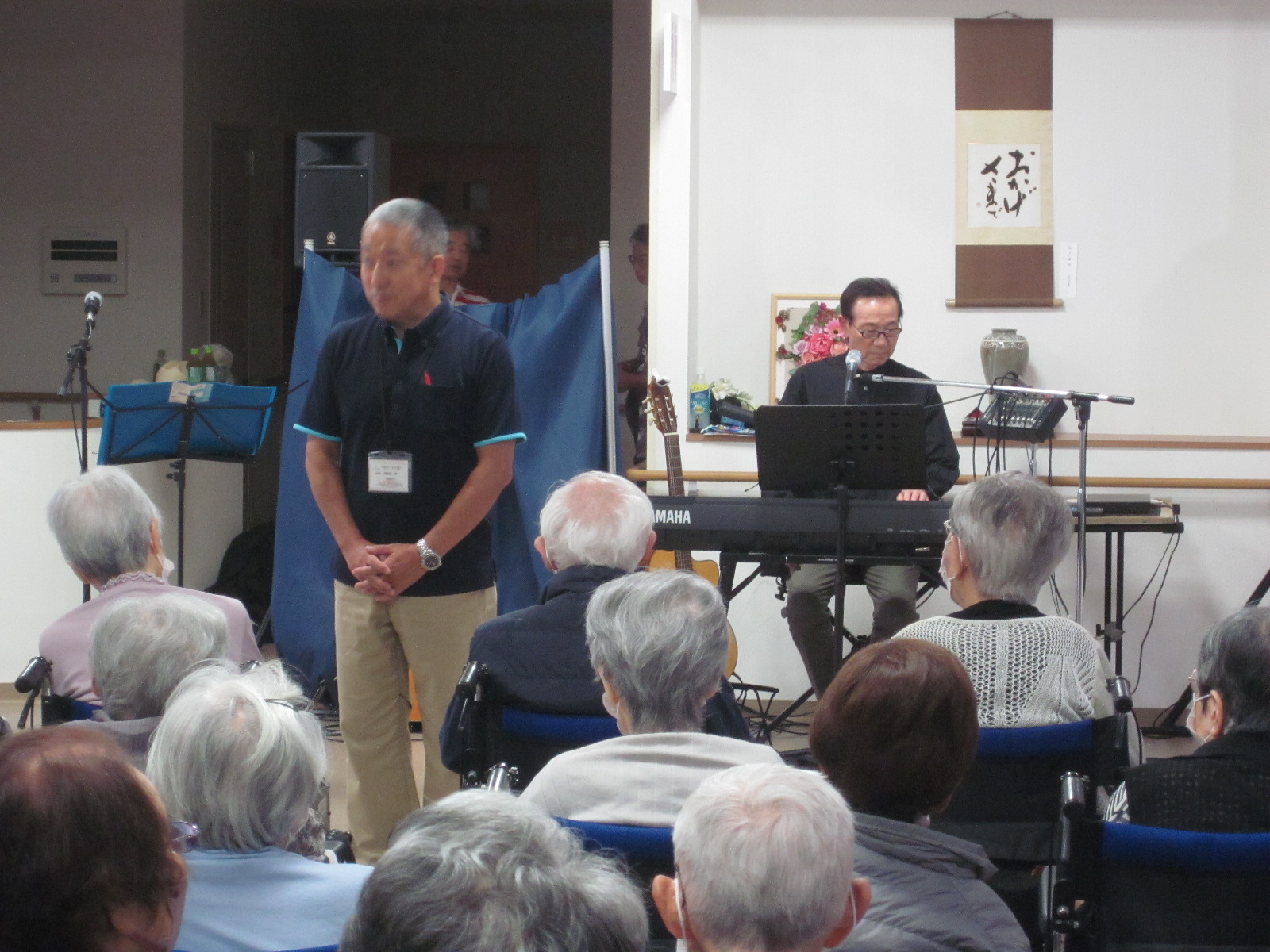 トピックス ケアイン秋の音楽祭2024 2024年10月4日 10月3日㈭ケアインファースト栄3階フロアにて秋の音楽祭を開催致しました。 辻様をはじめゲストをお呼びして演奏と歌を披露して頂き、入居者の皆様と一緒に芸術の秋を堪能させて頂きました。 利用者様の青春時代の歌から情熱的な歌まで幅広いジャンルの曲に自然と手拍子も聞こえ、終始参加者の笑顔の絶えない時間を共有できました。素敵な時間をありがとうございました。 演奏を聴いて頂いた後はプリンアラモードで食欲の秋を楽しんで頂きました。 普段、食が細い方も残さず食べられ喜ばれているようでした。 トピックス一覧へ
