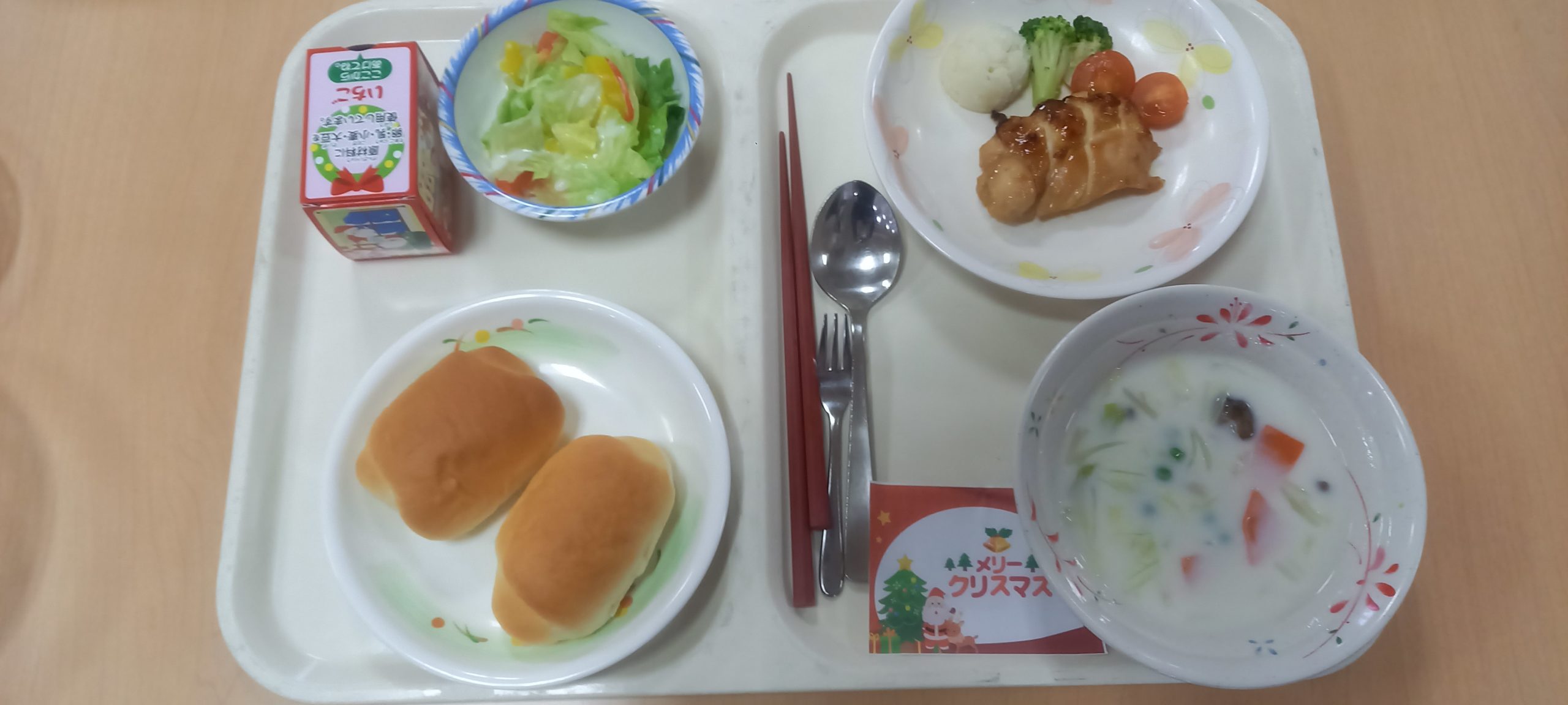 トピックス メリークリスマス! 2024年12月24日 12月24日 今日はクリスマスランチ! ロールパン 鶏肉の照り焼き 野菜サラダ クリーム煮 ケーキ 彩も良く 「おいしい」と入居者さまにご好評いただきました アレルギーの方はこちら チョコムース 王道 イチゴのケーキ 3F 受付前のアイドル❤ サンタとトナカイ クリスマスツリーとともに 見られるのは明日まで! トピックス一覧へ