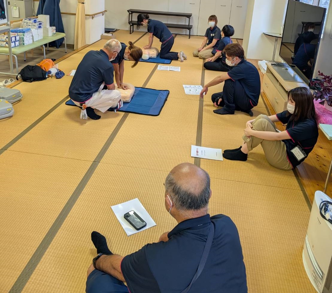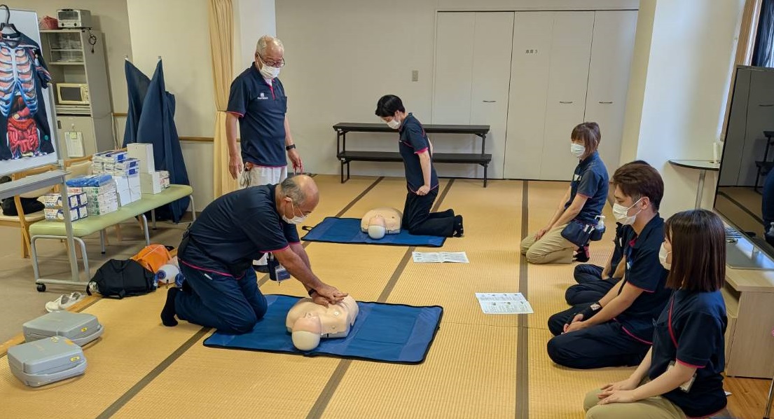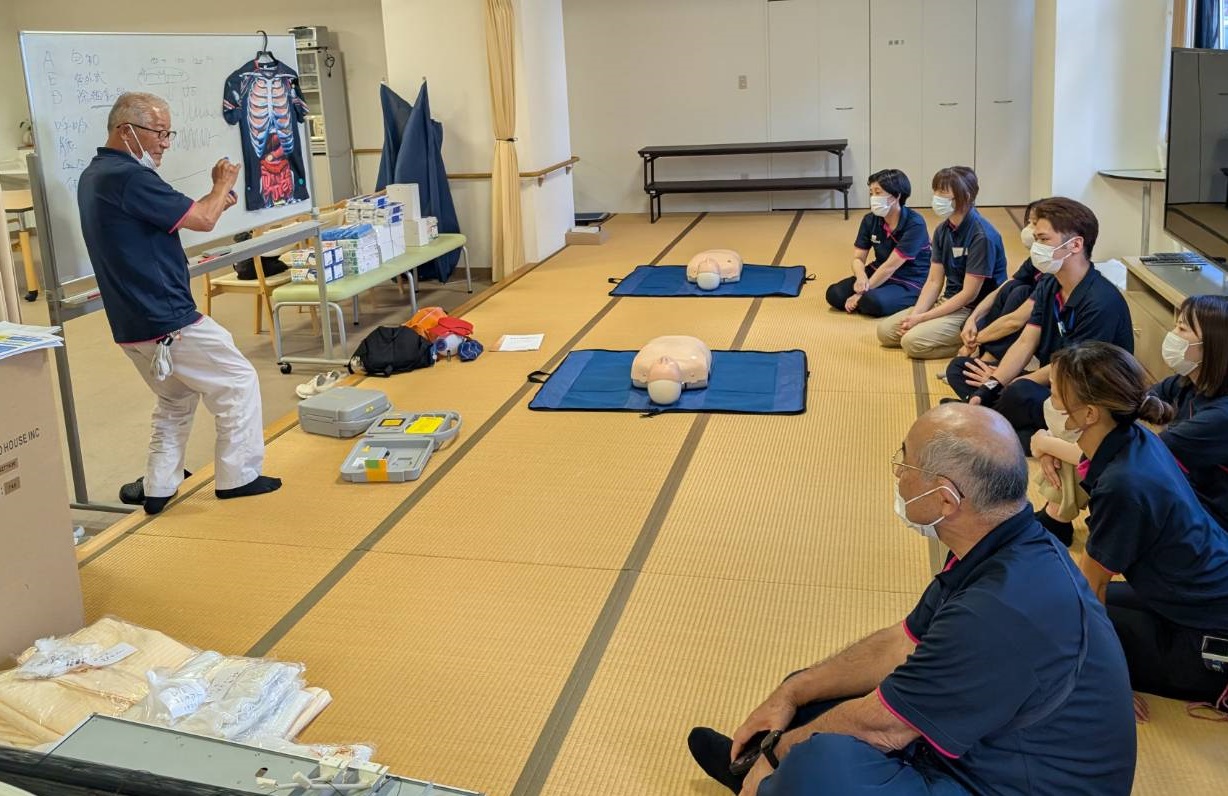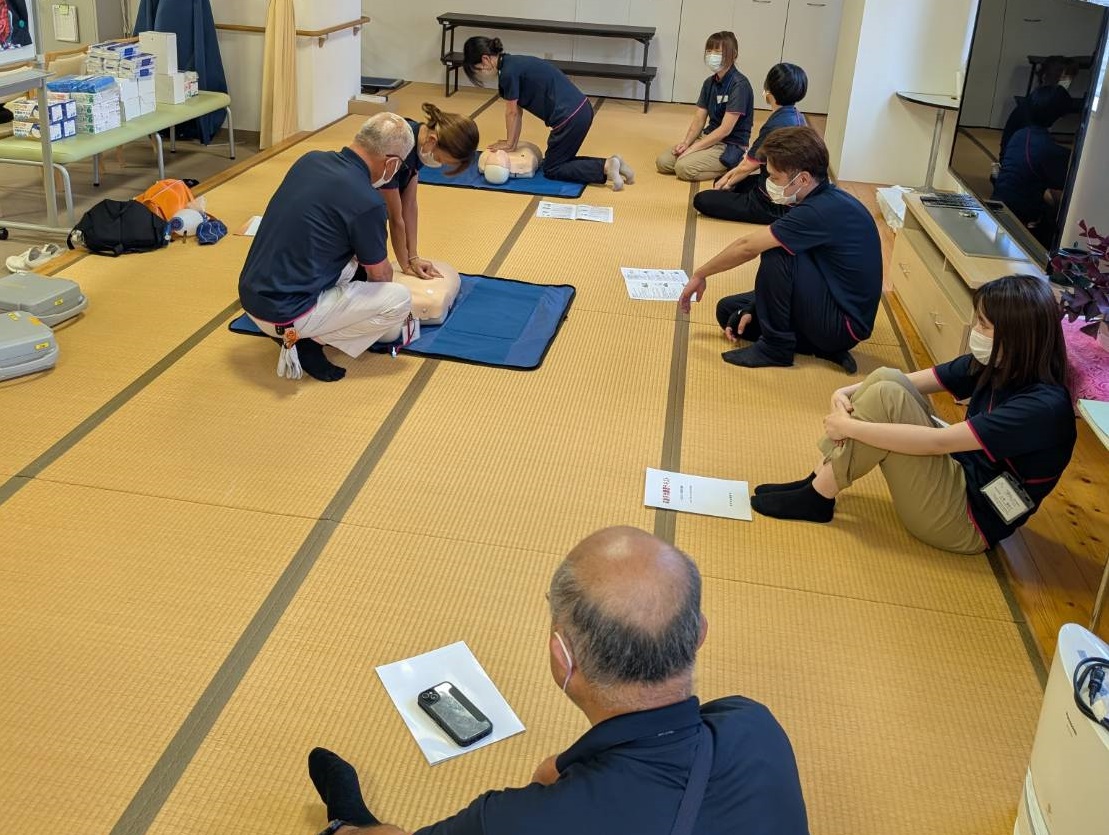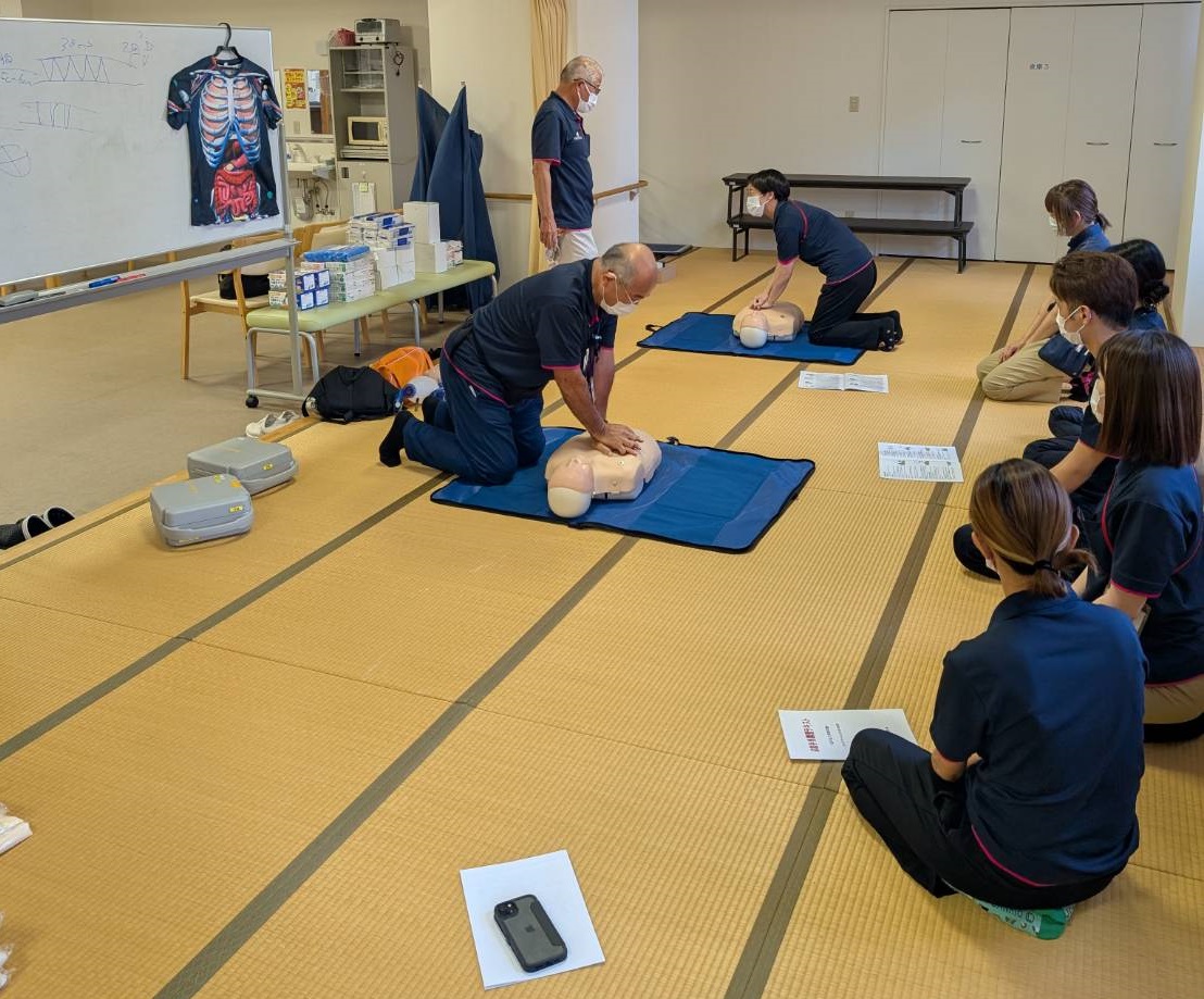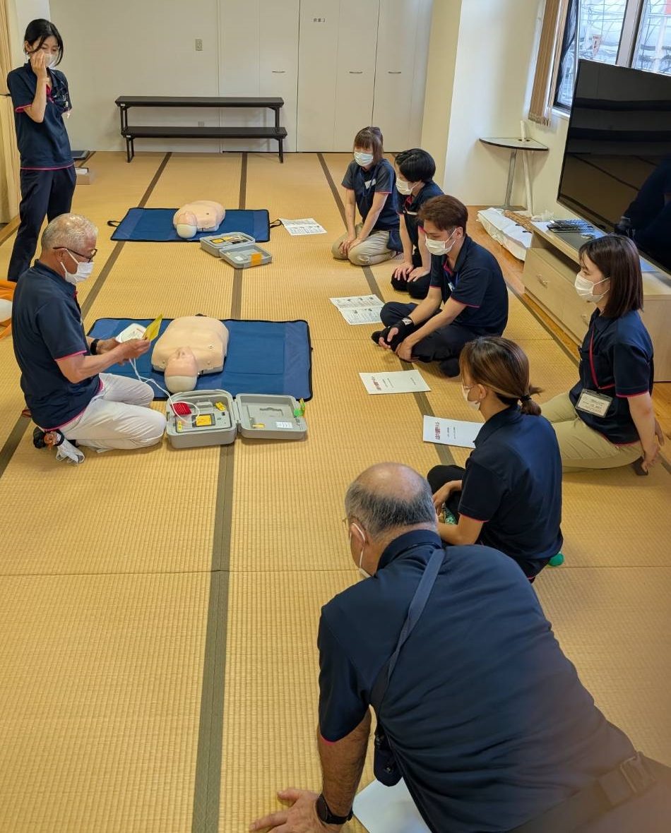 令和7年7月25日、ケアインファースト栄 3階にてAED(自動体外式除細動器)の研修を実施しました。