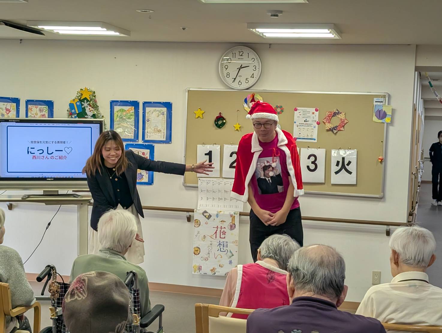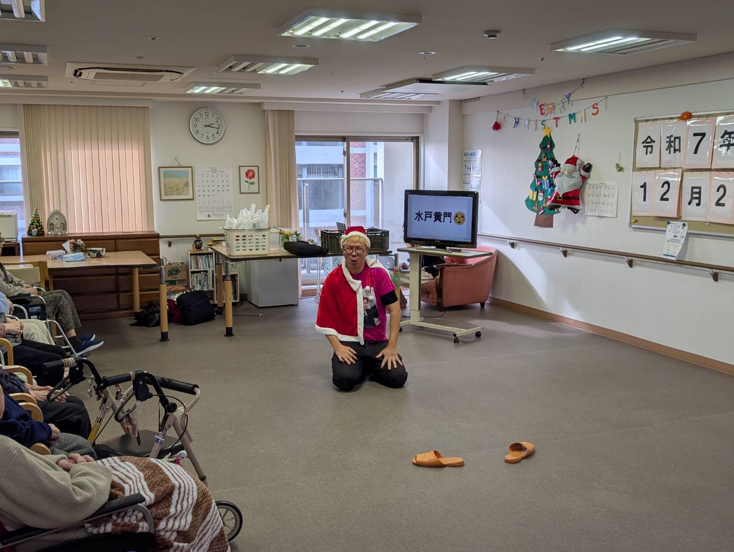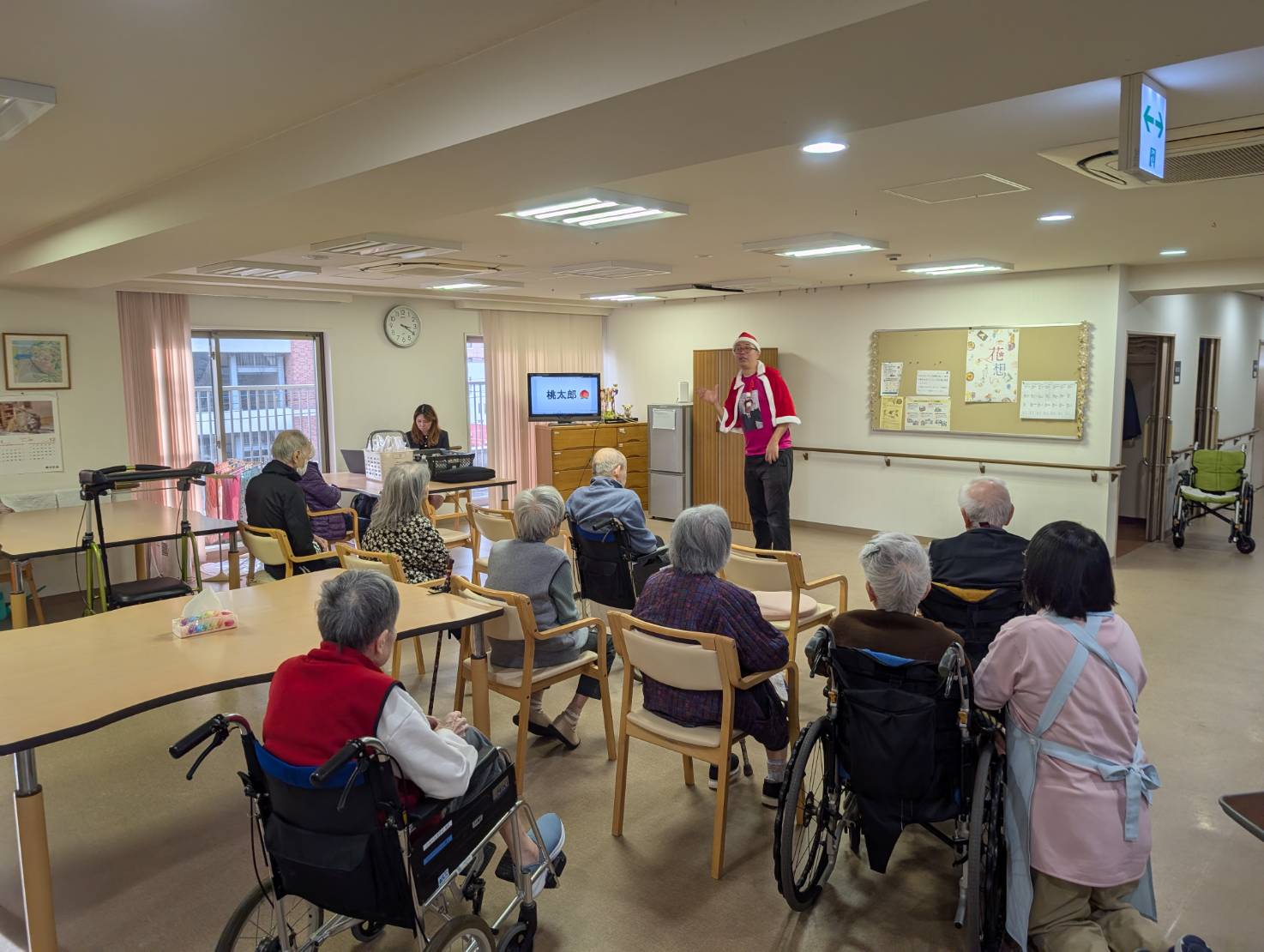 今年度は、毎年行っているクリスマス会を”冬のイベント”として名称を変更し、事業所としてお世話になっています税理士法人ウィズラン所属の俳優の西川(にしかわ)様に一人芝居をお願いし、住宅型・介護付・ショートステイの各事業所ごとにフルパワー😊で大きな声で頑張って頂きました。”桃太郎””水戸黄門”の二本の一人芝居を8役、9役と演じてもらい、真剣に観賞される方、笑顔で観賞される方と様々でした。次回は、また別のネタでお願いしたいと思います👍
